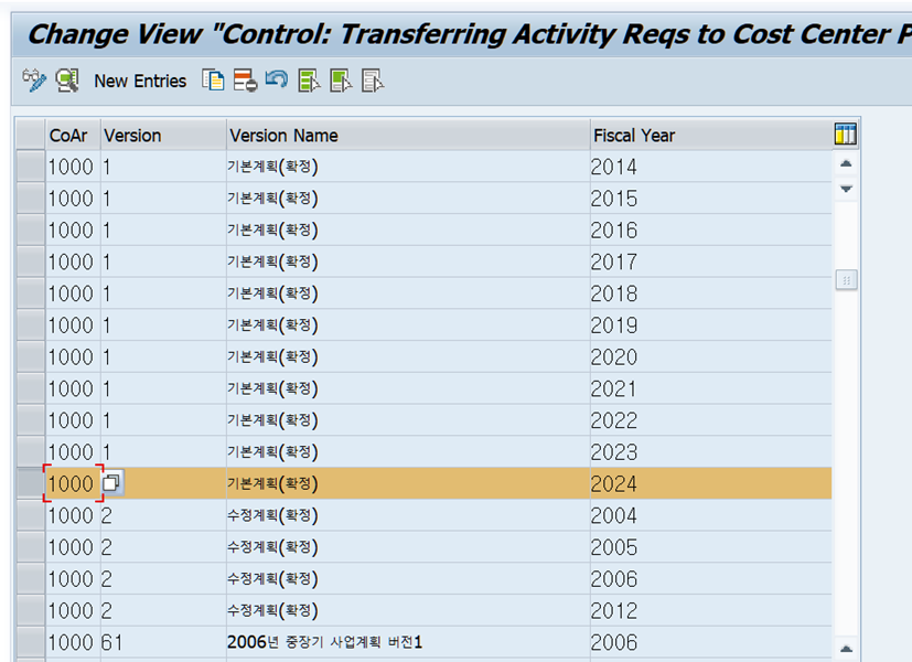 해당 Controlling Area에 생성되어 있는 버전 및 기능 설정 화면이 보입니다.