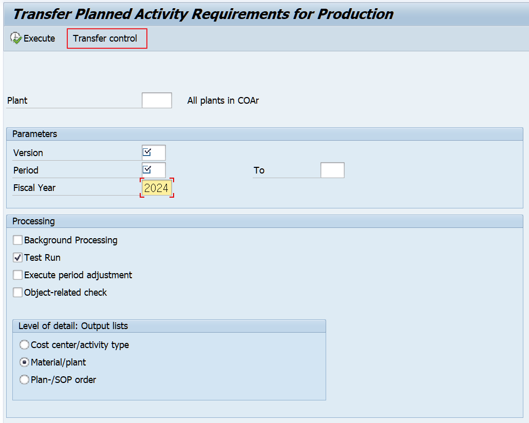 실제 LTP 데이터를 Cost Center로 전송하는 화면으로 상단 ' Transfer control' 버튼을