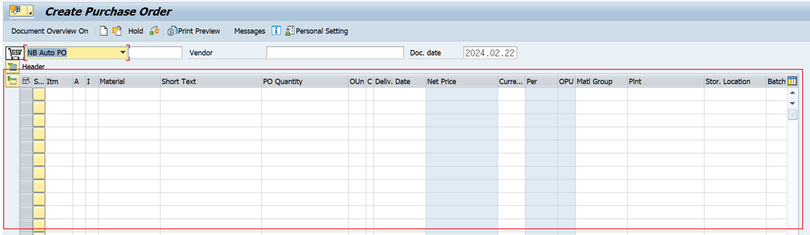 - T-code : ME21N 화면에서의 Table Control 레이아웃
