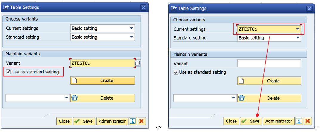 - 생성한 Table Control Variant는 동일한 프로그램을 사용하는 Transaction의 Table Control 레이아웃에서 모두 동일하게 사용 가능합니다.