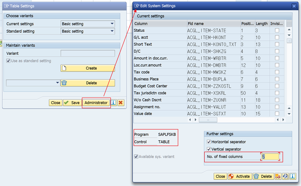 - 각 Transaction은 달라도 Table Control 설정 아이콘이 동일하게 존재합니다. (Table Control 상단 오른쪽)