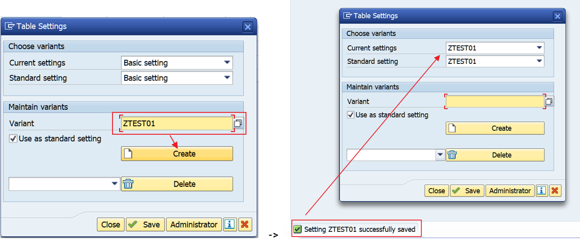 - Variant 이름 지정 후 ‘Create’ 클릭을 클릭하면, Table Control 레이아웃 설정이 저장됩니다.