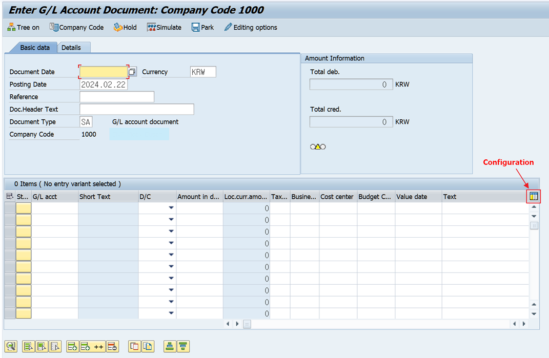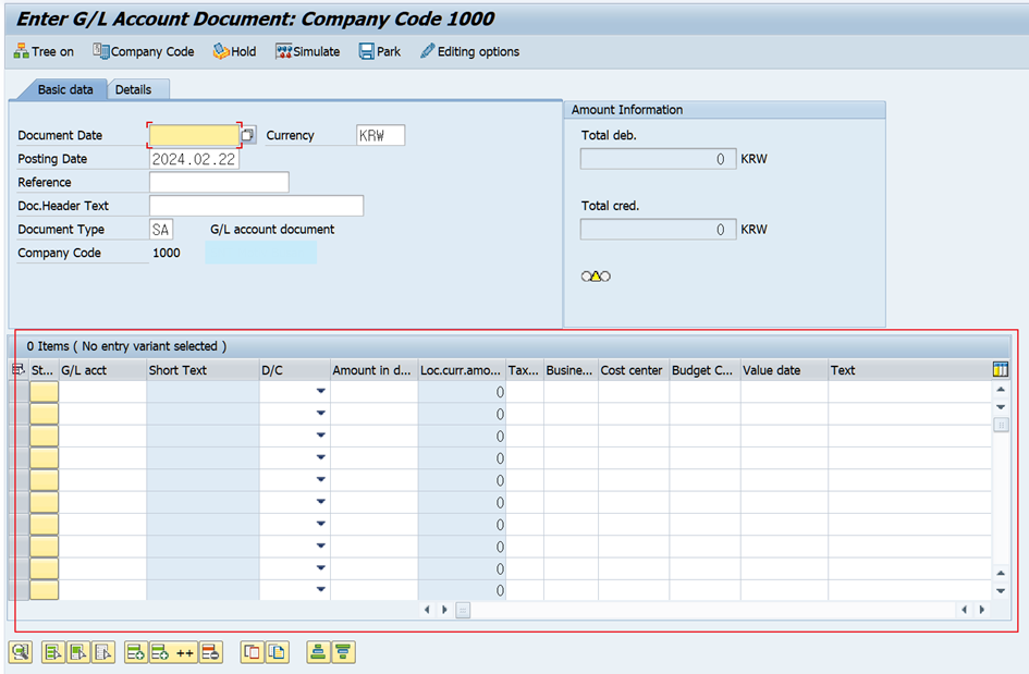 - T-code : FB50 화면을 예시로 Table Control 레이아웃 설정에 대해 알아보도록 하겠습니다.