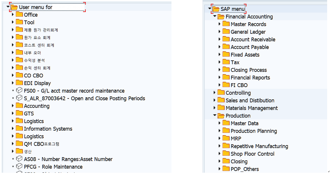- 위 화면과 같이 기본적으로 하위 폴더나 T-code를 입력하여, 메뉴를 구성합니다.