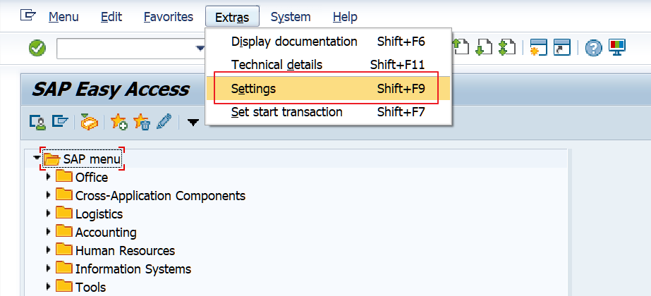 - Display techincal names : 메뉴에 T-code(Transaction Code)를 보이게/안 보이게 설정할 수 있습니다.