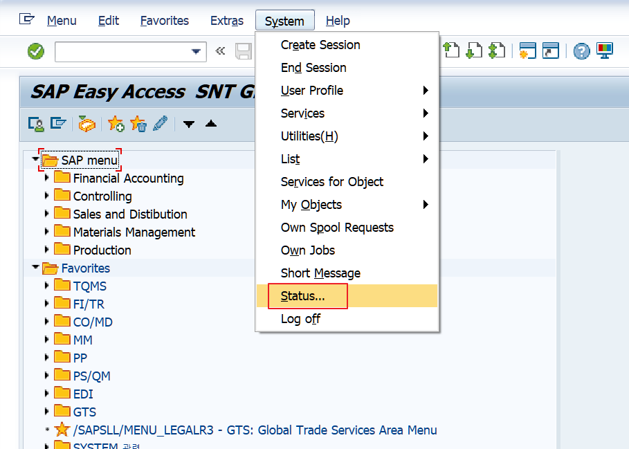 메뉴바 System -> Status를 통해 SAP 시스템의 버전, 서버 호스트 및 데이터베이스 정보와
