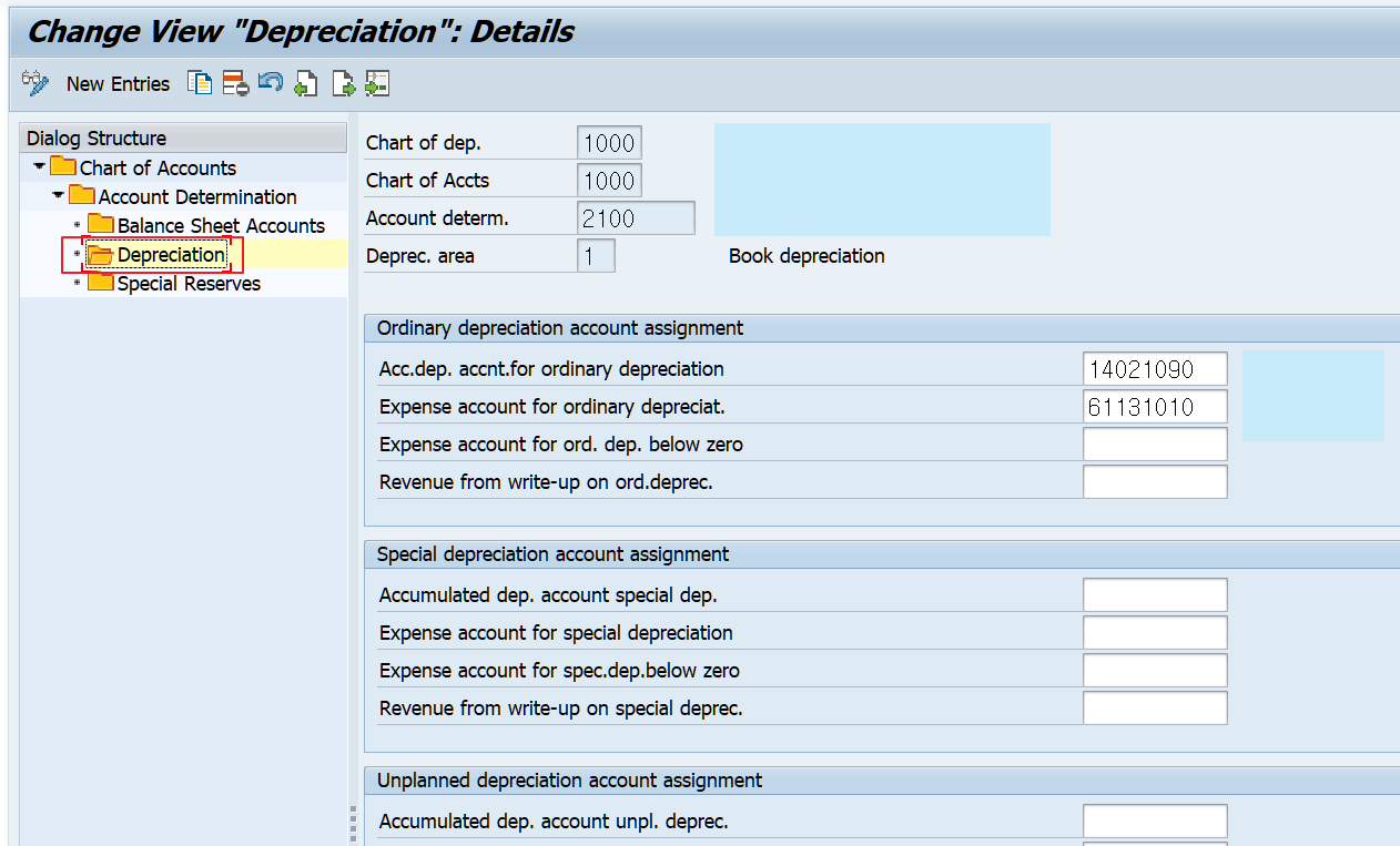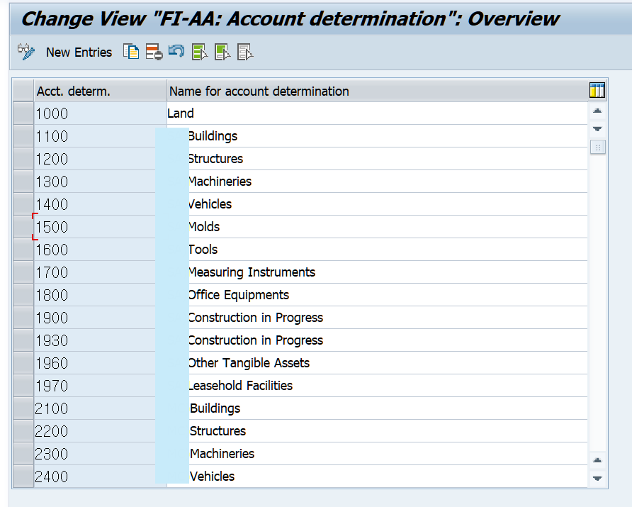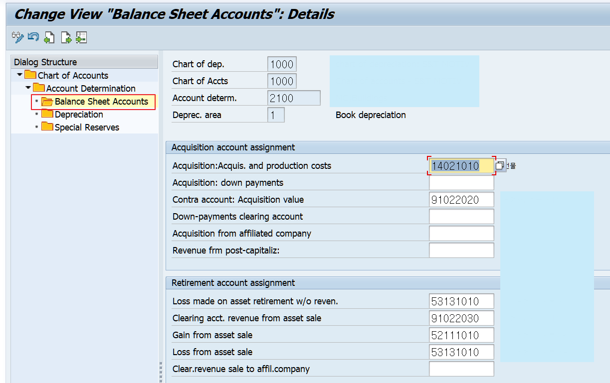 - 신규 자산 클래스 생성 시 연결한 '계정결정 지정(Account Determination)' 필드에 필요한 계정 설정을 합니다.