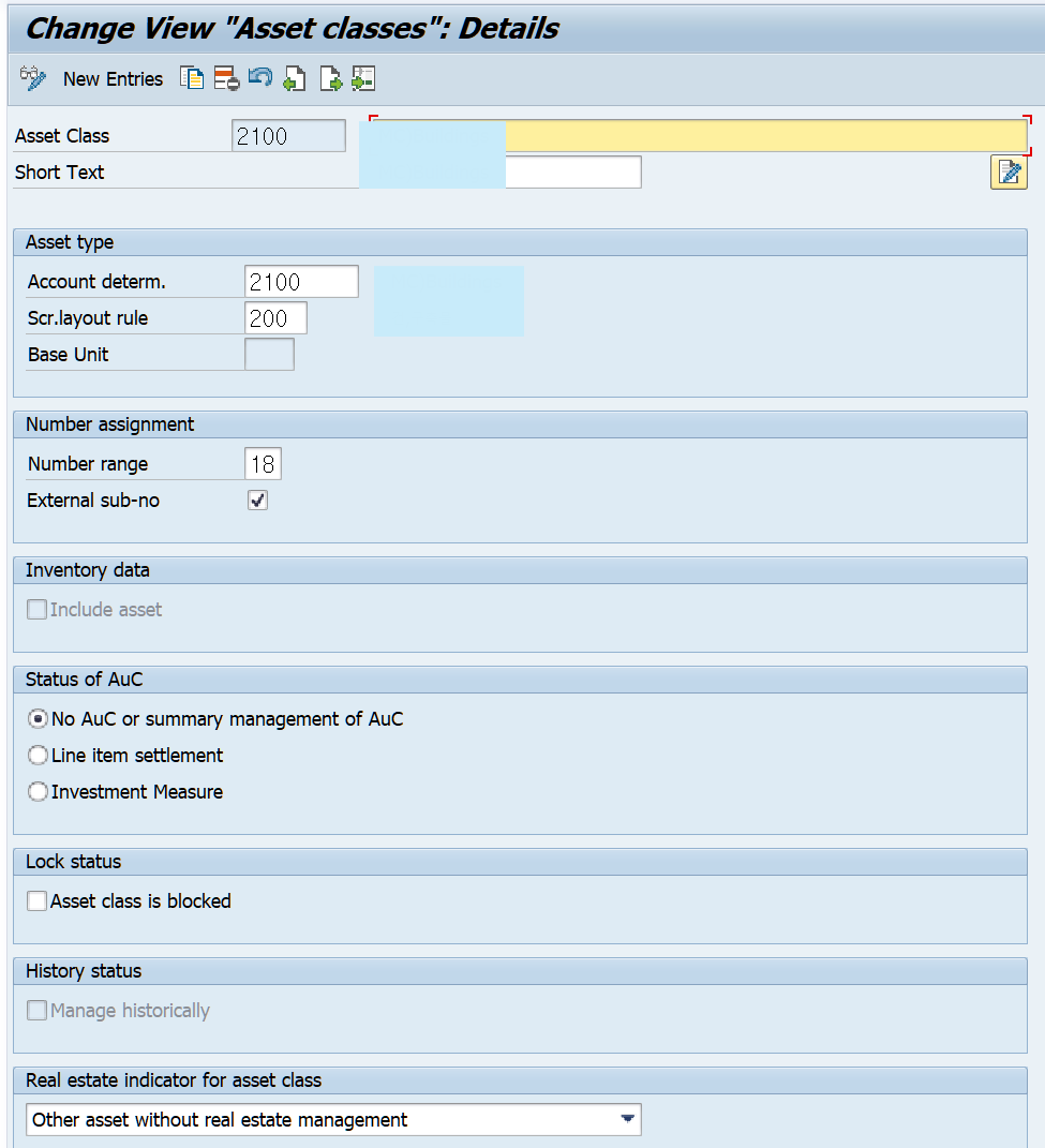 - Account determ. 필드는 자산 클래스 생성 전에 생성한 필드이며, 필요시 Number range 설정합니다.
